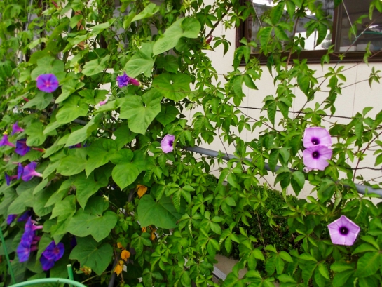 グリーンカーテンは今年も順調です。先月上旬に植付けて、今の状況をご紹介いたします。手前は地植えしてある『オカワカメ』です。無事に越冬して、一番の成長頭です。今年は『もみじ葉琉球あさがお』と『琉球あさがお』『あばしゴーヤ』の3種類で緑のカーテンを施します。おまけで手前には『きゅうり』『ミニトマト』『なす』も植えてみました。みどりのカーテンも楽しみですが、野菜の収穫も楽しみです。上が『もみじ葉琉球あさがお』です。