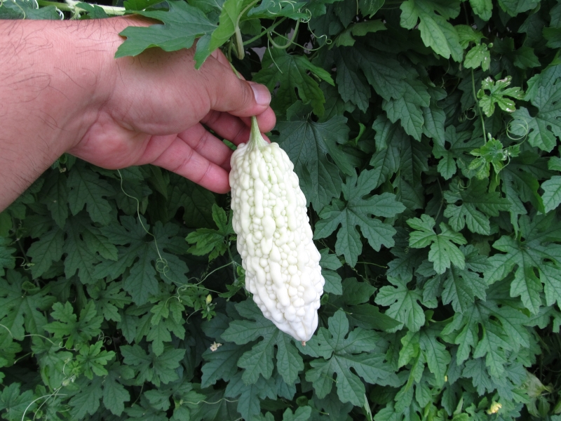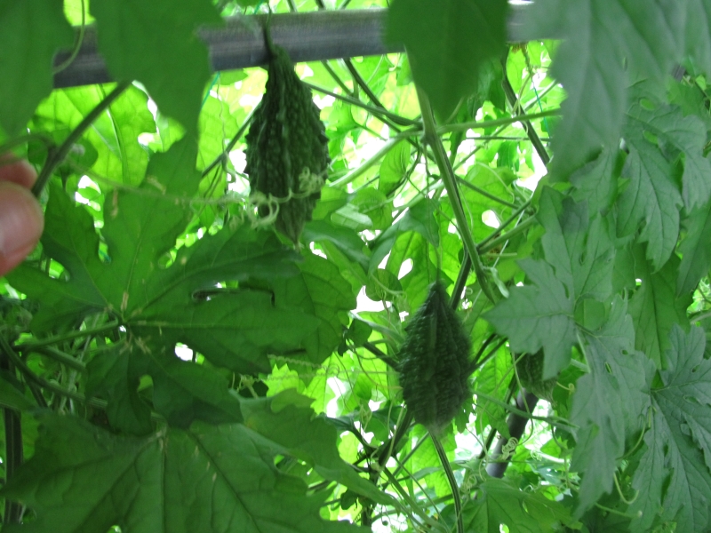 こんなになりました。ゴーヤはいろいろな種類を植えまして、このように生りました。手前のグリーンカーテンは「琉球アサガオ」です。カーテンの役をしております。強い日差しを押さえ、見た目も涼しい気持ちにさせてくれます。青い花は琉球朝顔